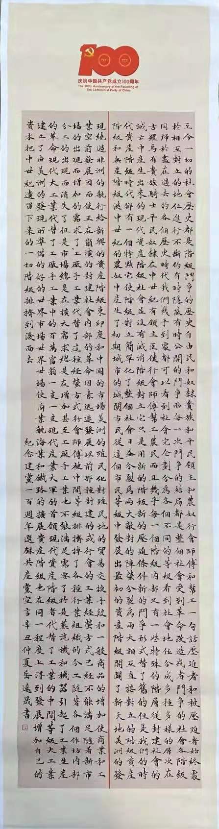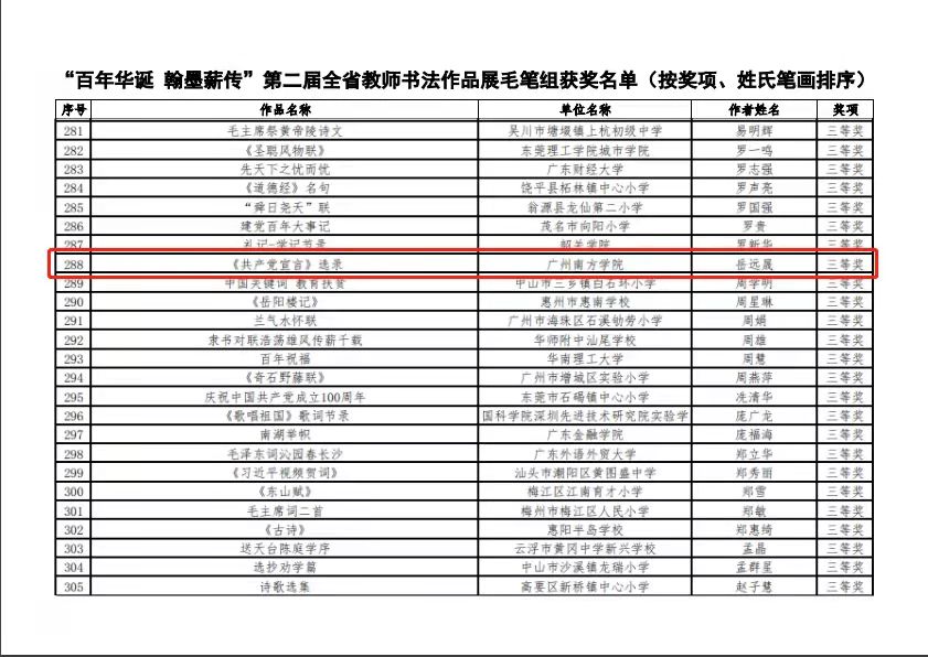 2021年10月9日,由广东省教育厅主办的“百年华诞 翰墨薪传”第二届广东省教师书法作品展在广州白云国际会议中心开幕。williamhill英国官网外国语学院青年教师岳远晟的书法作品《< 共产党宣言>选录》在全省5509件报送作品中脱颖而出,获得“百年华诞 翰墨薪传”第二届全省教师书法作品展毛笔组三等奖。
